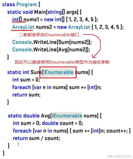 比如以下代码,供需双方都遵守IEnumerable接口 ——