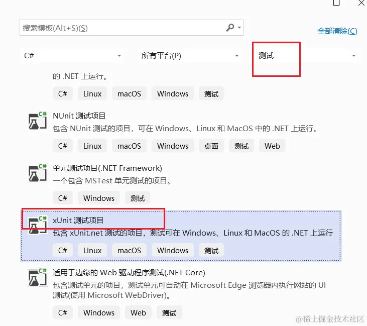 右键解决方案——添加——新建项目——选择测试——推荐使用xUnit(.Net平台自己使用,兼容性比较好)