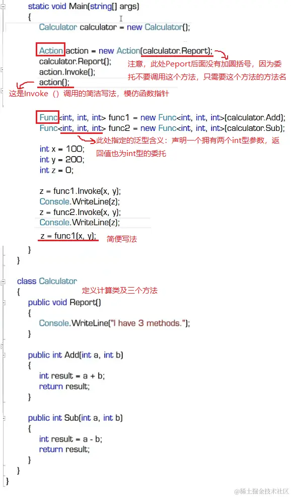 不同于C中函数指针要先声明再使用,C#类库中已定义了许多常用的委托类型可以直接使用。常用的委托有:Action委托、Func委托