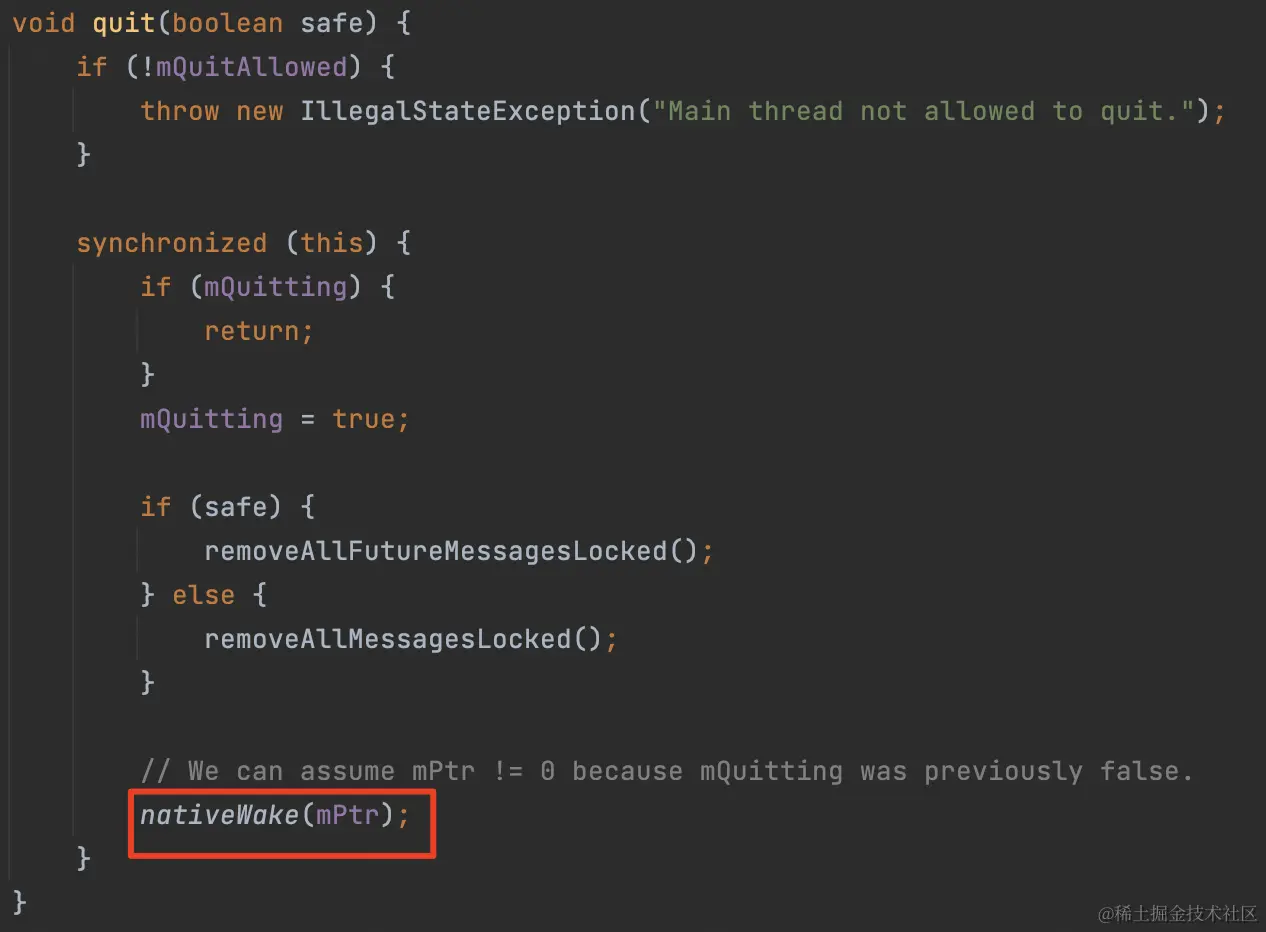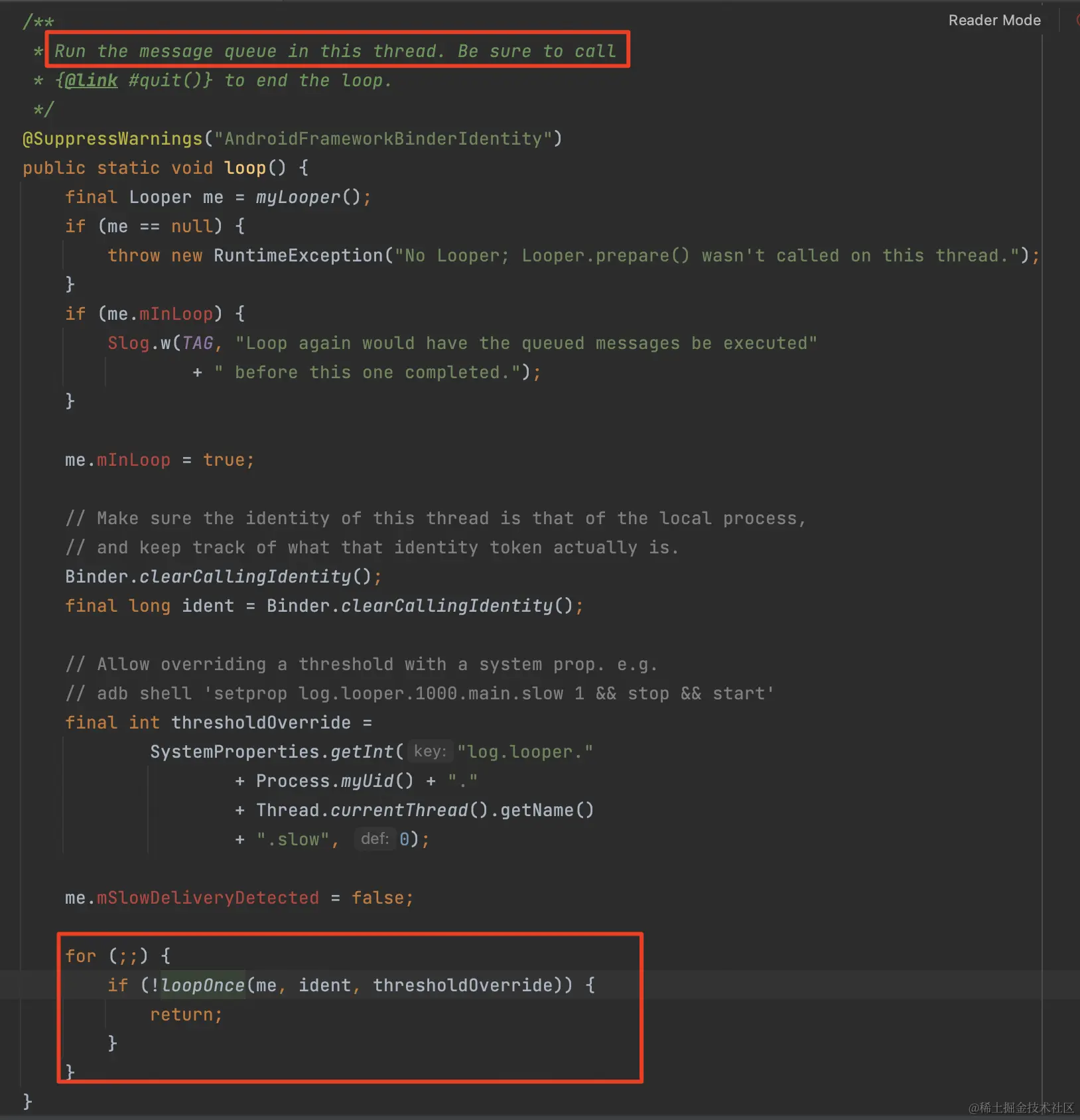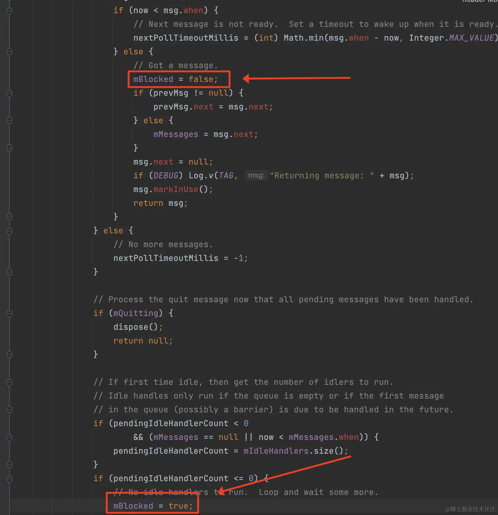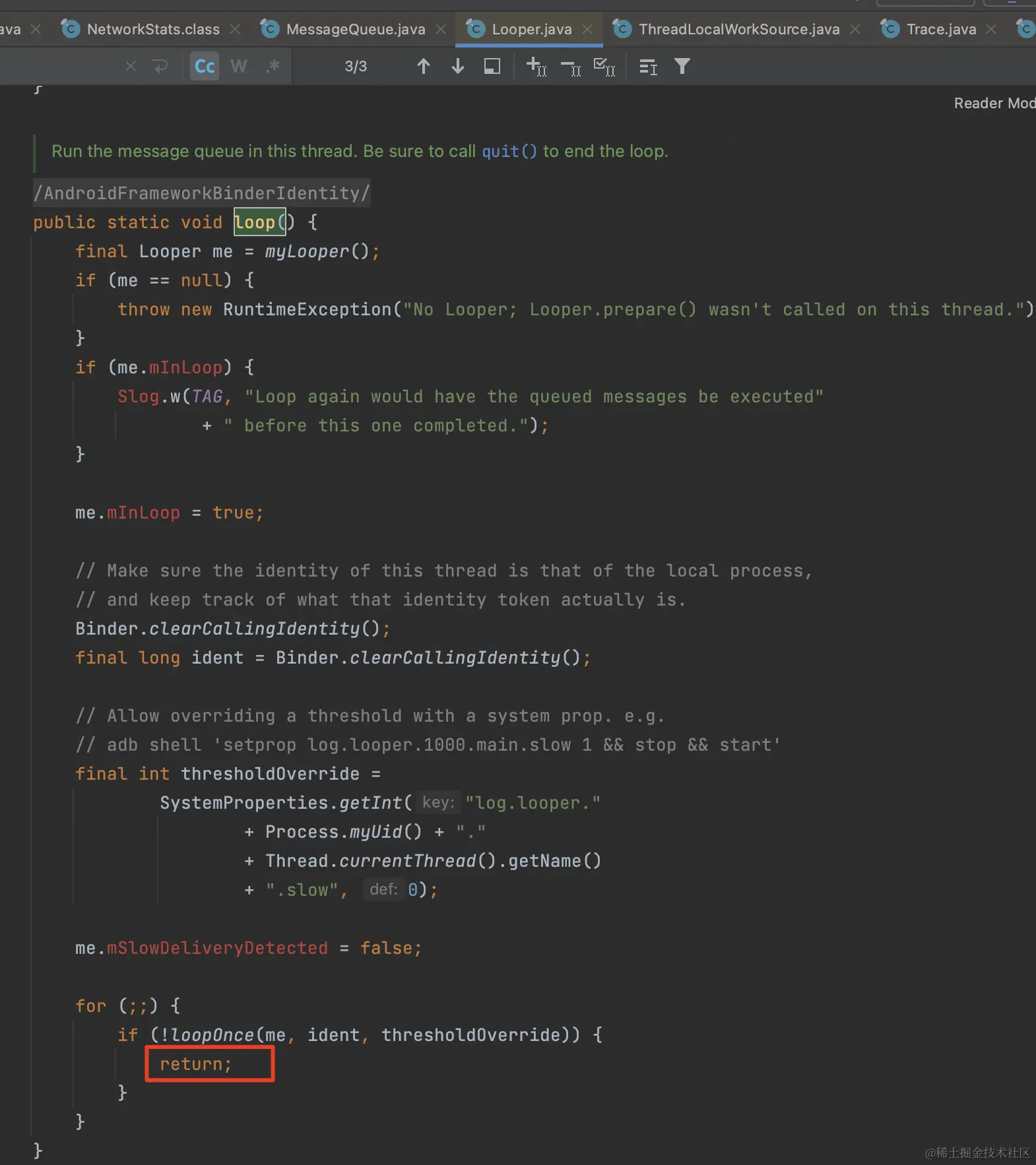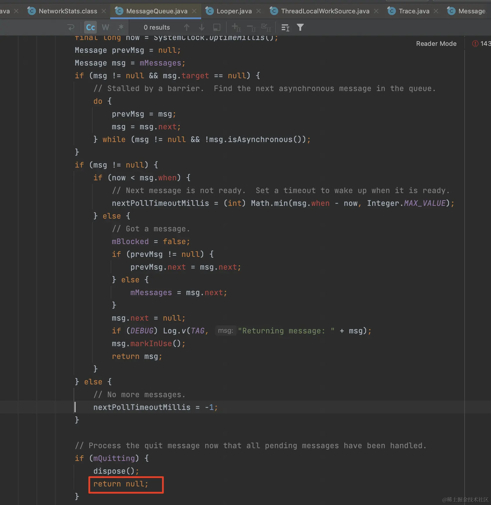 我们都知道Looper的loop是进行消息循环的方法。当退出的时候,MessageQueue的next方法会返回null