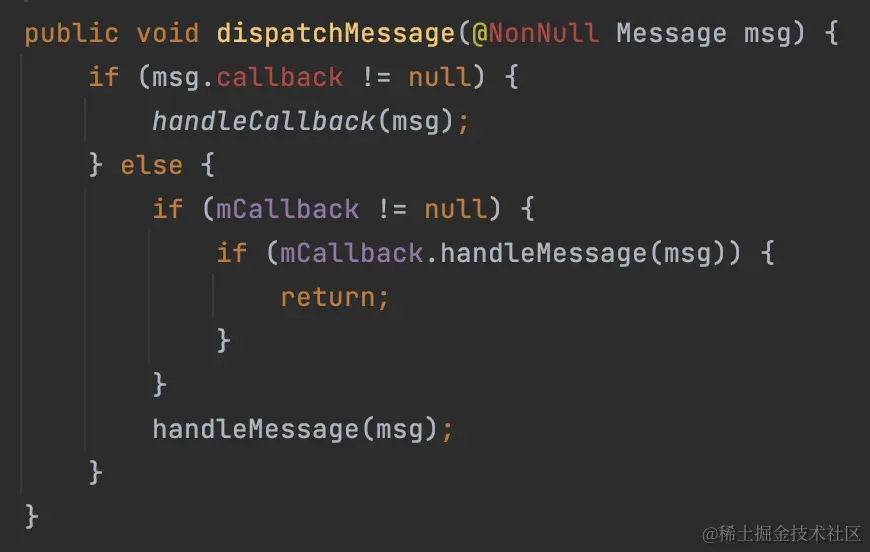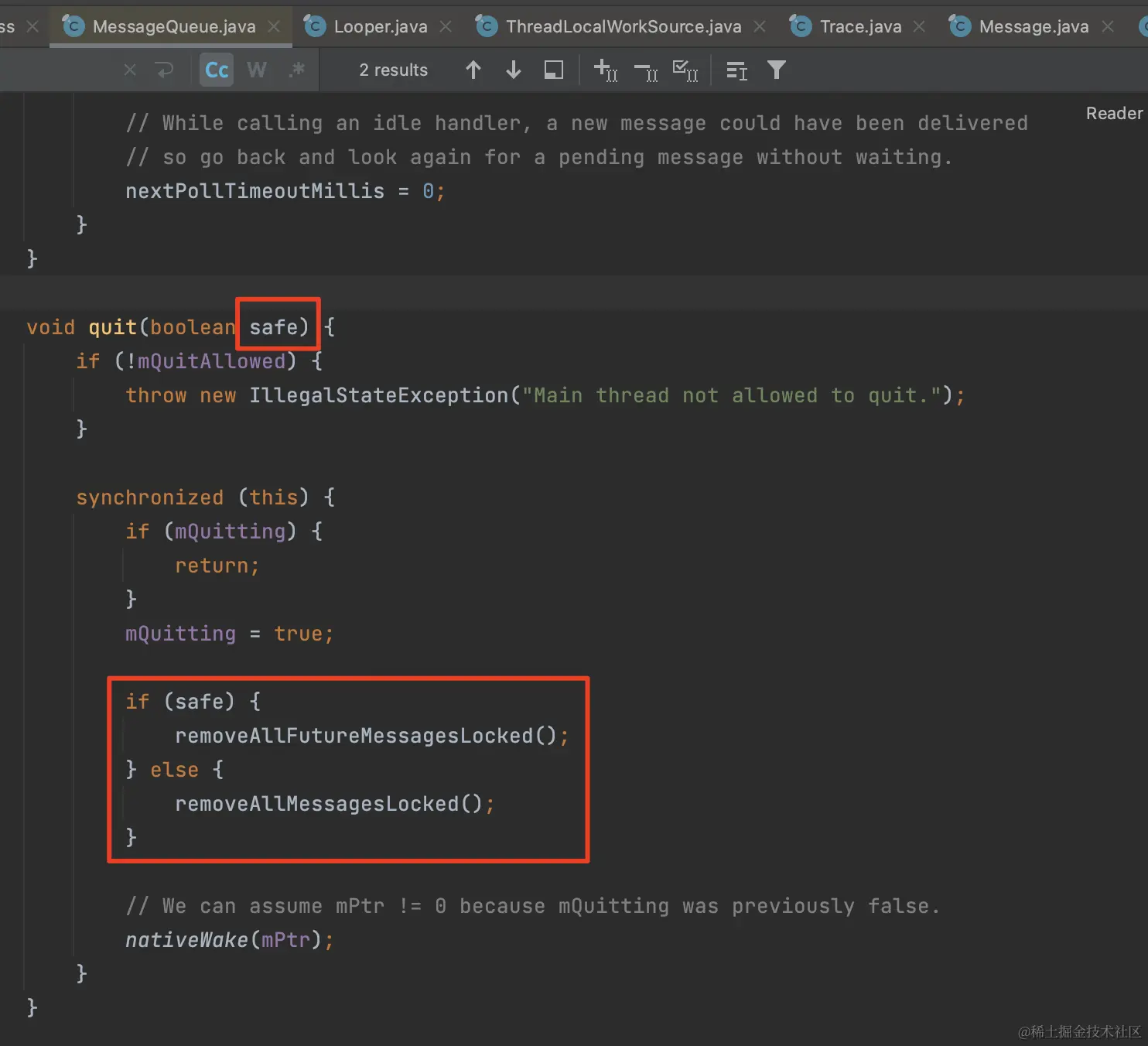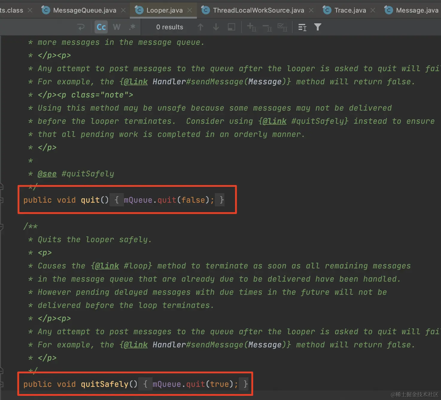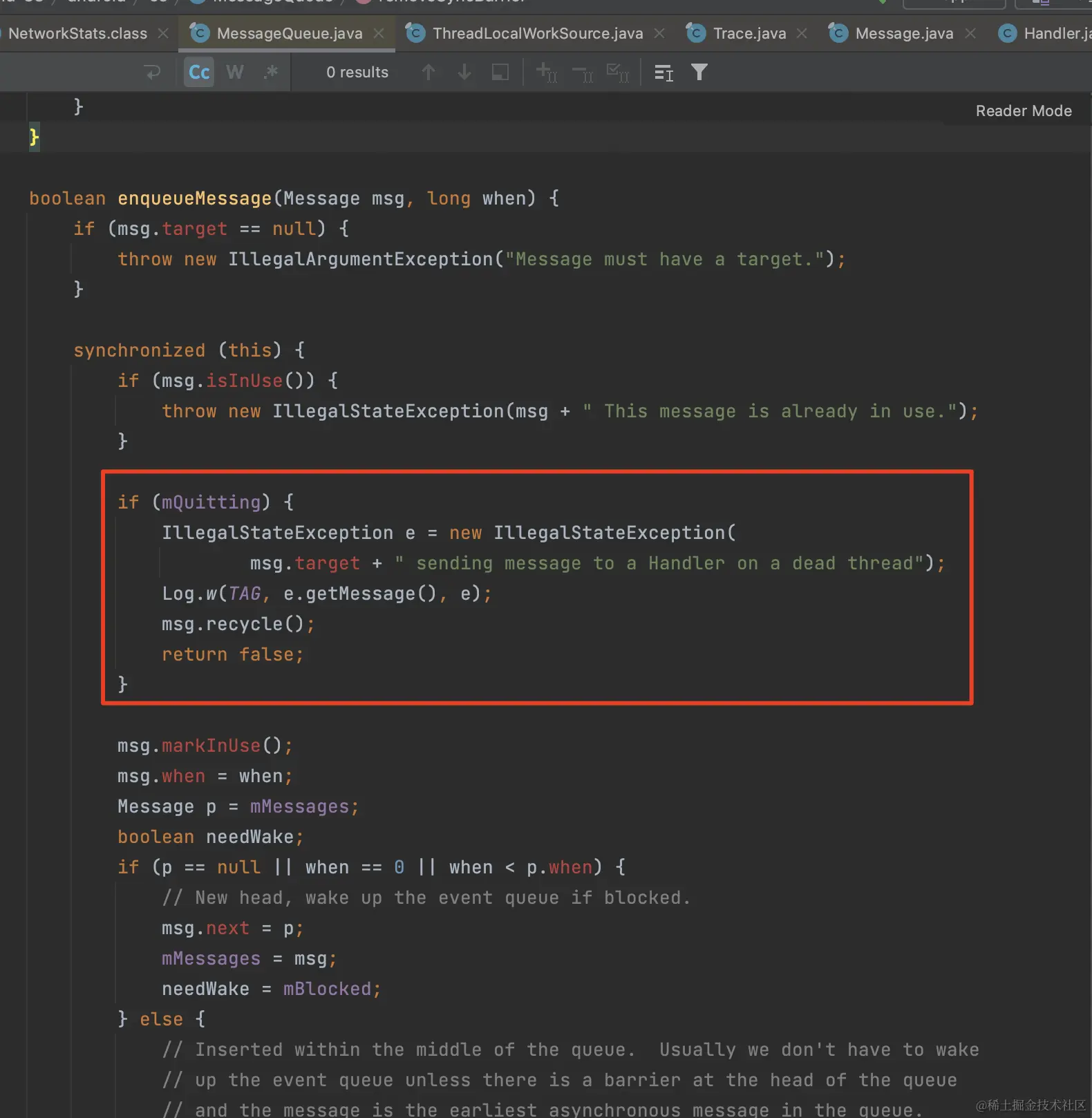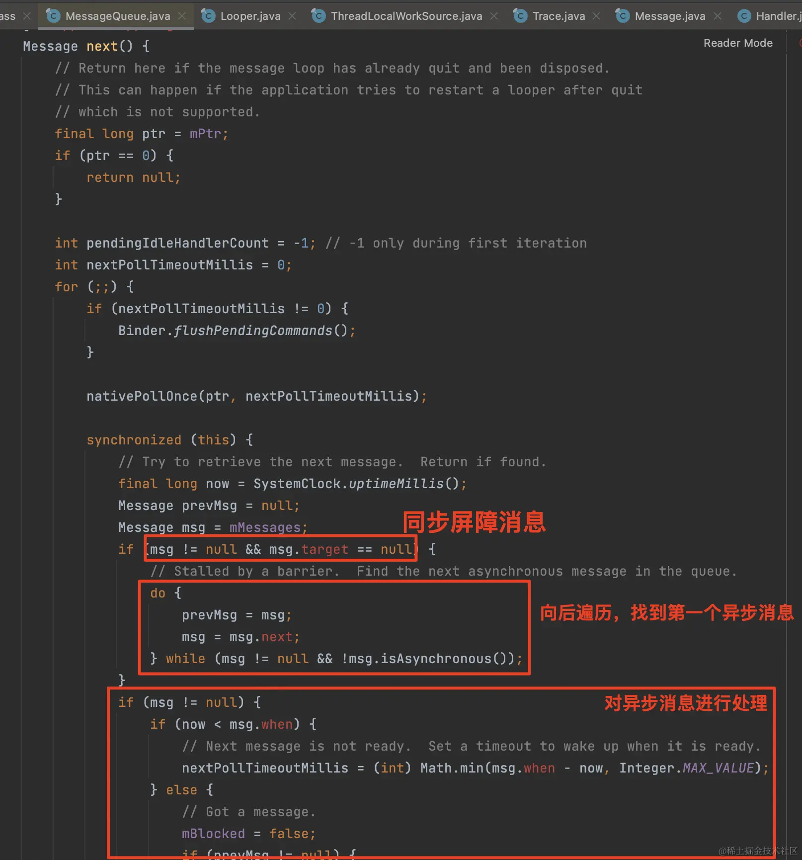 我们都知道Looper的loop是进行消息循环的方法。当退出的时候,MessageQueue的next方法会返回null