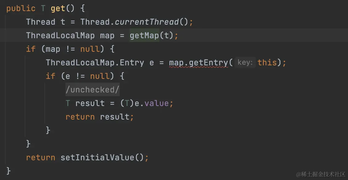 在每次调用ThreadLocal的get方法时,会首先拿到当前执行的线程,这个线程里面有一个变量,是ThreadLocalMap类型的,key是ThreadLocal,value就是我们想要得到的值
