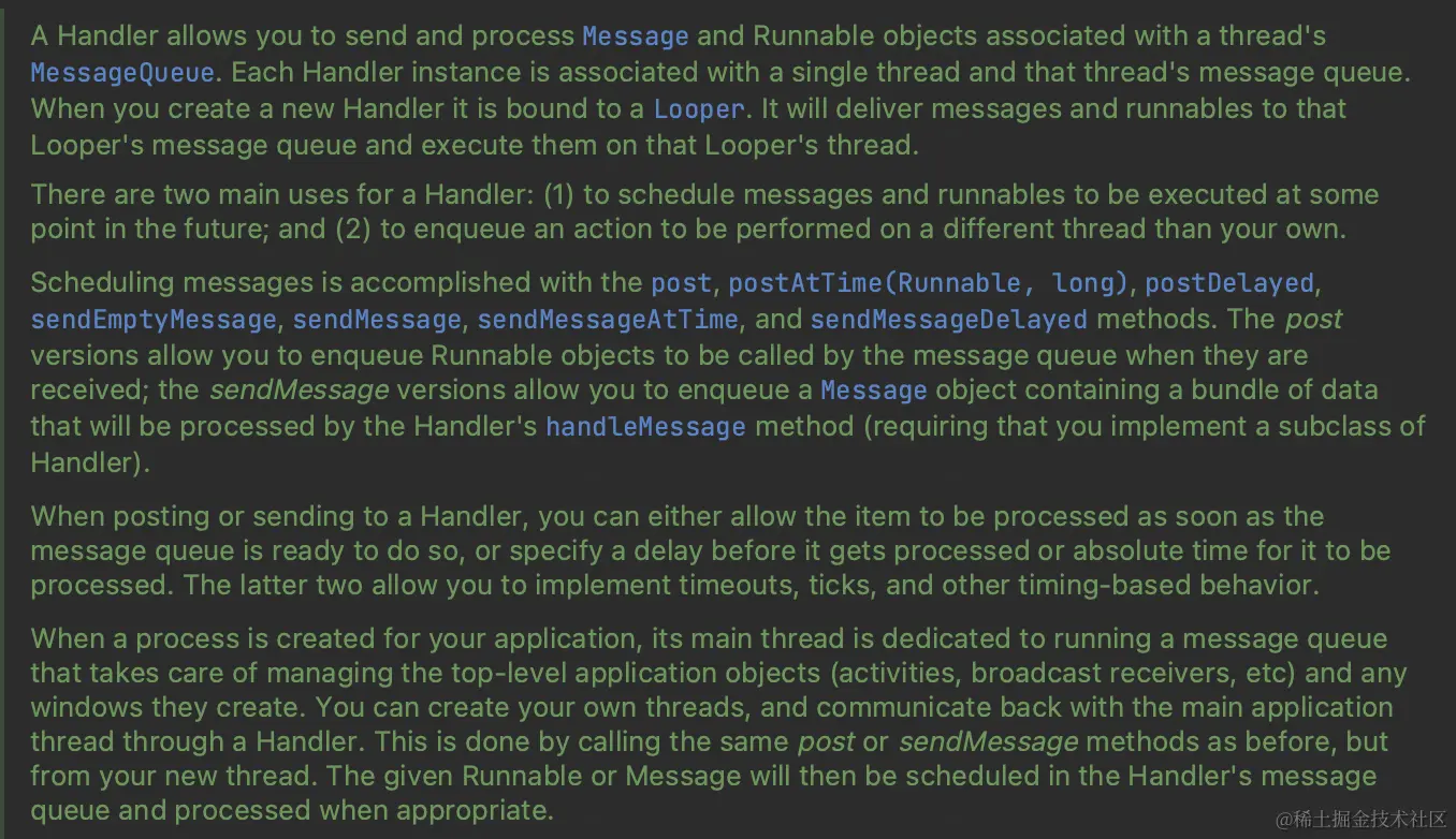 这张图,可以说非常详细、生动地展现了Handler机制整体的运行原理。再结合上文,对各个角色的解释,相信你很容易就能看懂了。那么,对自己要求高的人,肯定还是不满于此,是不是还想扒开源码看看?OK,我来满足你的需求。