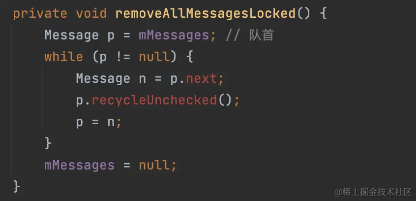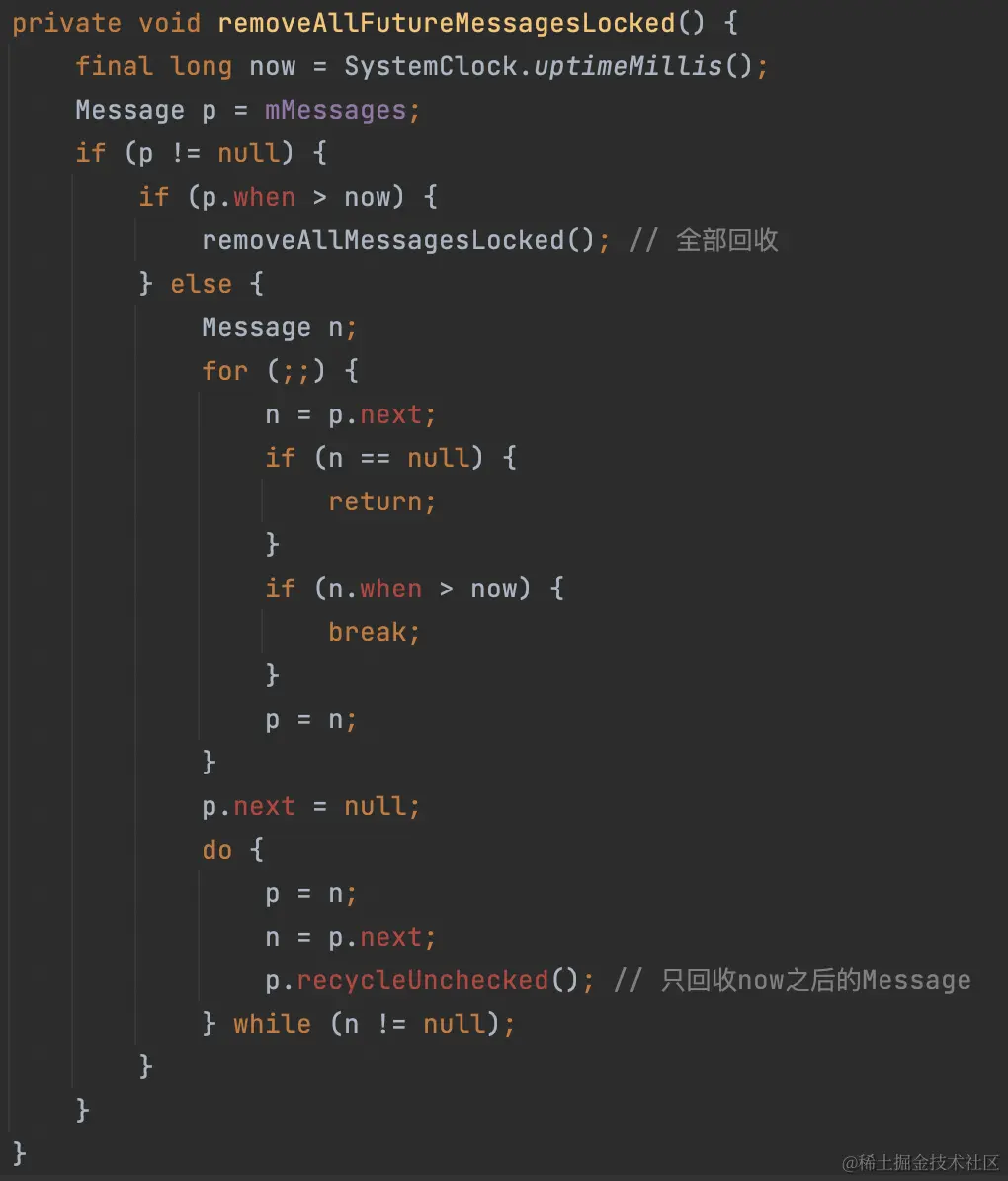在这里,它会判断队首的message的when属性,和now的大小。如果now小于when,则说明队首的消息不满足被取出的条件,则调用removeAllMessagesLocked方法,将所有的消息全部回收。否则就向后遍历到第一个不符合取出要求的message,将它以及它后面的message全部回收。