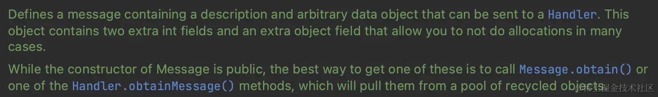 Message是一个消息类,可以被Handler放到消息队列,也可以被取出,交给Handler来处理。它的what、when、data、target、setAsynchronous等一些属性和方法比较常用,同时它还实现了缓存复用,可以通过obtain来复用Message