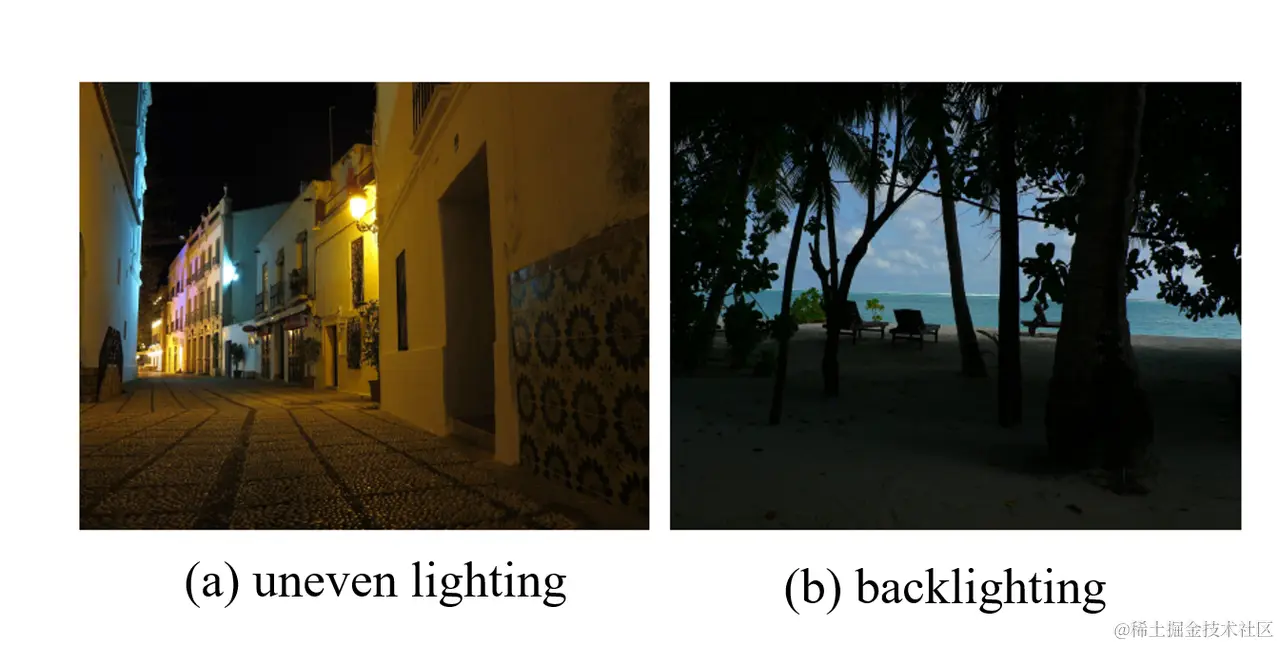 由于光学器件固有的局限性和外部成像条件的限制,低光图像是一类常见的低质量图像。下图中我们列出了两种低光图像,分别是在光照不均匀的环境下和逆光下拍摄的。 我们可以观察到,这样的低光图像会给用户带来不好的视觉体验,并且由于缺乏细节而难以获取内容信息,这将进一步影响下游的视觉任务,例如语义分割、对象检测等等。