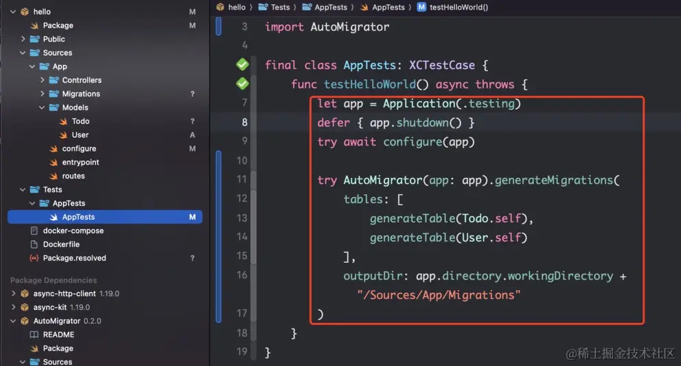 完工,以后每修改模型,跑一下testHelloWorld测试用例,就会自动将修改生成到 Migrations 目录下,然后我们将手动调用下新增的迁移类就行。