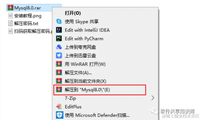 1.通过文章末尾处下载软件后,右键【Mysql8.0】选择【解压到Mysql8.0】,然后进入到解压后的文件夹。