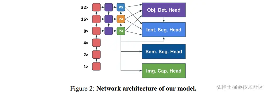 本文以ELAN设计为网络的主轴,将YOLOR的概念作为系统的基础架构来构建网络的主干。然后,采用了硬参数共享机制来进行多任务学习,为各个任务设计了轻量级的头部,如目标检测、实例分割和语义分割,并将它们合并到图像编码器中以执行图像字幕生成任务。