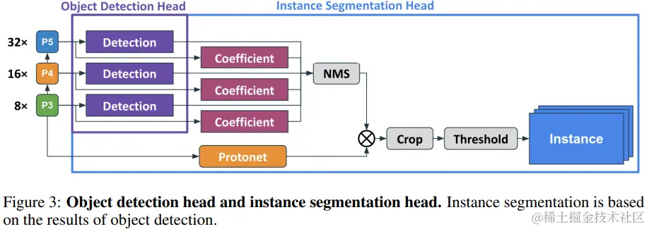 对于目标检测任务,这里直接采用了 YOLOv7 的目标检测头部。对于实例分割任务,则选择了YOLACT模型,该工作是在 YOLO 架构上添加了一个实例分割头部。其中,YOLOv7 中有一个分支将 YOLACT 与实例分割任务合并在一起,因此选择了这个头部来执行实例分割任务。这个头部在实时实例分割任务中表现出色,并且理论上可以简单地与任意基于 YOLO 的架构进行融合。下图展示了目标检测头部和实例分割头部的架构:
