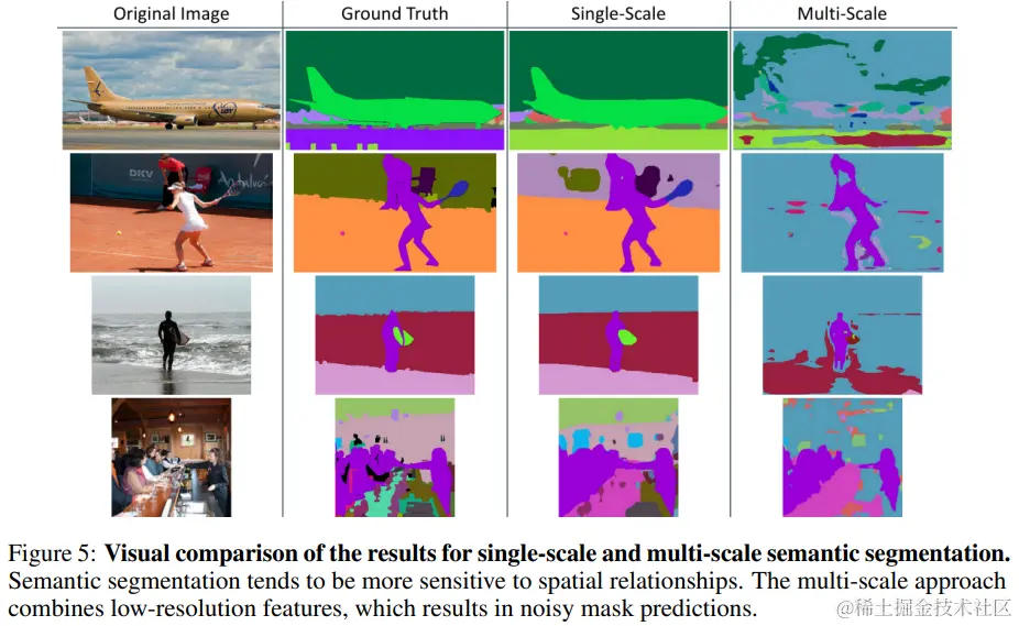 可以看到,多尺度模型在 stuff 区域的预测结果有噪音。作者认为这是目标检测和语义分割任务之间语义差距的结果。目标检测试图将所有非实例的区域都分类为背景,因此无论是天空、墙壁、天花板还是地面,都容易被分类为相同的类别。而对于语义分割任务,空间关系的敏感性相对重要,因此尝试选择在最高分辨率(即8×8)上以单尺度方式设计语义分割头部。