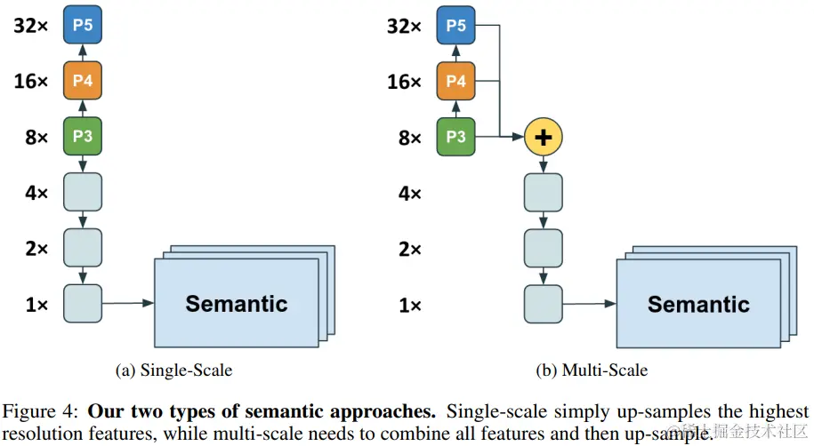对于语义分割任务,作者探索了使用单尺度和多尺度特征组合对语义分割的影响。具体地,他们设计了两种方法来获取语义掩码。一种是直接将特征图从最接近原始分辨率的8×8分辨率上采样到1×1的分辨率(单尺度),另一种是将颈部三种不同分辨率(8×8、16×16和32×32)的特征图组合起来,然后上采样到1×1(多尺度)。