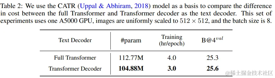 表2显示,他们使用了 CATR 模型,该模型使用全尺度的 Transformer 作为文本解码器,并将其结果与仅使用 Transformer 解码器的结果进行了比较。总体参数数量减少了7.5%,训练时间减少了25%,而 BLEU-4 分数略有提高。文中假设全尺度的 Transformer 性能较差,是因为其与主干网络存在冲突,因为主干网络已经执行了自注意力,与 Transformer 编码器的功能重叠。根据这一实验的结果,他们使用了一个简化的 Transformer 文本解码器,并再次将 ELAN+YOLOR 用作主干网络。