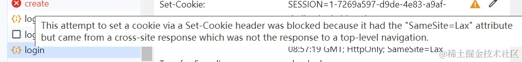 下图是发送login请求时的set-Cookie请求头中的警告,翻译过来就是:通过set-cookie标头设置cookie的尝试被阻止,因为它具有“SameSite=Lax”属性,但来自跨站点响应,而该响应不是对顶级导航的响应。