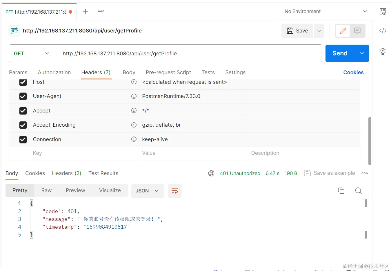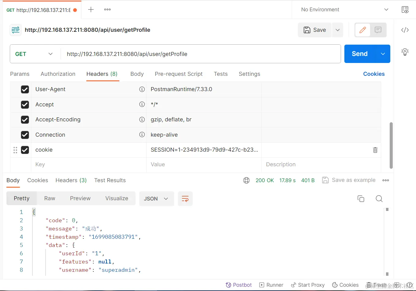 但是最诡异的地方就是经过一系列的排查,我发现用别人的电脑就可以访问,甚至于说我自己我用自己的虚拟机也可以访问,但是就是我的电脑上访问不了。我在后端打断点debug的时候发现我发送的请求没有登录信息。于是我就检查我和同学的两个人的电脑之间发送的请求头的差距,发现我的电脑上的请求头并没有发送cookie数据,而cookie数据就是记录登录信息的关键数据。