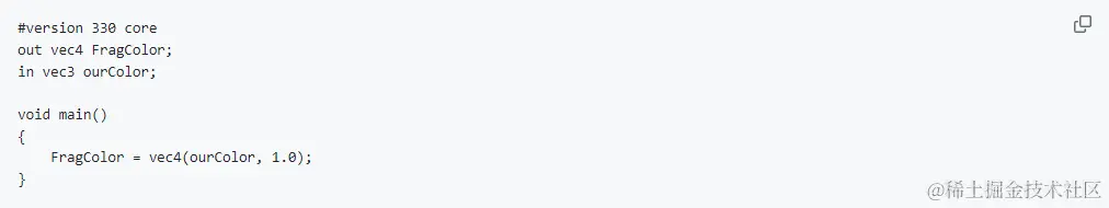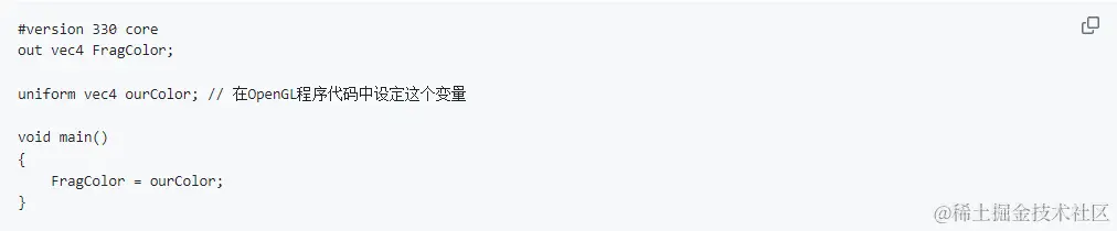 首先声明的是GLSL的版本号和模式,然后就是声明变量。像其他语言一样,声明变量我们要包括数据类型和变量名两个部分。而在GLSL中,我们还要指定变量的类型。