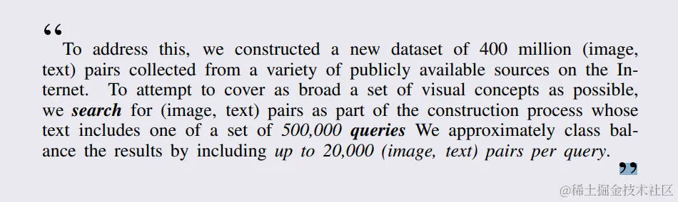 准备50万个查询,每个查询匹配2w张图片,共计4亿个图像-文本对。