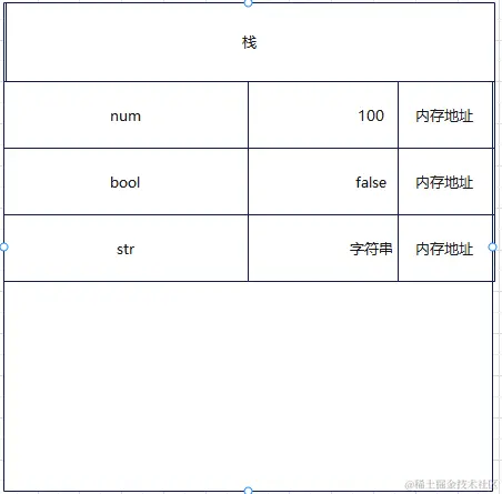 其中变量的值存储在变量指向的栈中的内存地址上,看上图,100就是存储在内存地址上