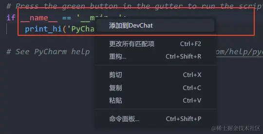 在编写的过程中,我们不确定该功能的具体实现,因此,我们可以通过DevChat直接在VS Code中发起讨论。我们只需用鼠标选中代码,然后在右键菜单中选择“在DevChat中讨论”,将代码发送到开发者群组。