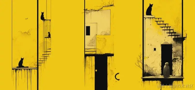 一系列插图,展示动物爬过黄色门,采用彼得·卒姆托、康拉德·罗塞特的风格,