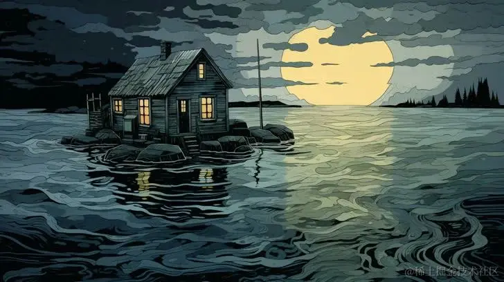 海水中的小房子插画由马克·米伦和卡蒂亚·莫拉·萨维茨创作,采用心理现象插图风格,不祥的氛围,充满能量的插图,文森特·德西德里奥,爱德华·蒙克,kintsugi,希望·冈格洛夫