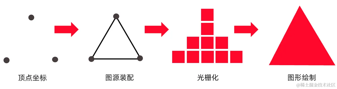 - 图元装配:将独立的顶点坐标装配成几何图形,图形的类别由 gl.drawArrays函数 第一个参数决定
