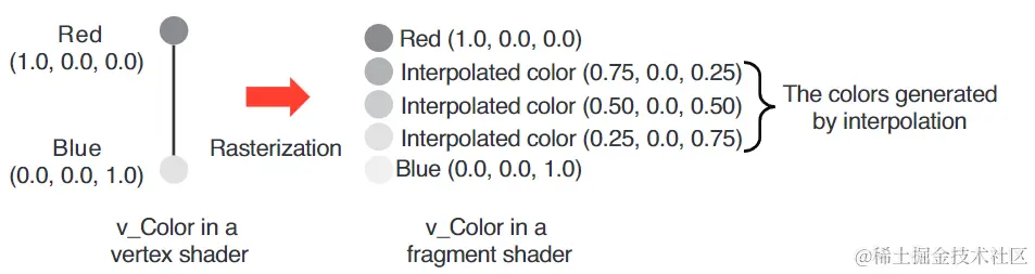 用varying变量为三个顶点指定三个不同颜色,三角形表面上的这些颜色值都是webgl系统通过内插计算出来。