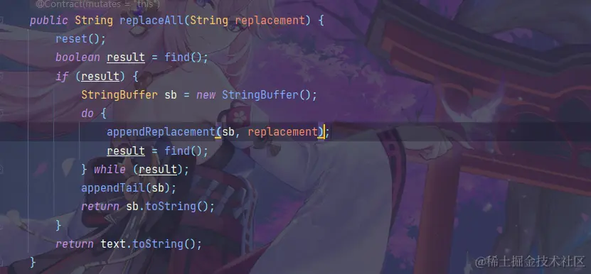 最后调用的是Matcher类中的replaceAll()方法,使用StringBuffer来进行字符串的拼接