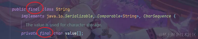 String确实是使用字符数组来进行存储的(至少JDK8是这样的,Java9字符串采用byte[]数组再加一个encoding-flag字段来保存字符),而且类和属性还用final来修饰以达到不可变。