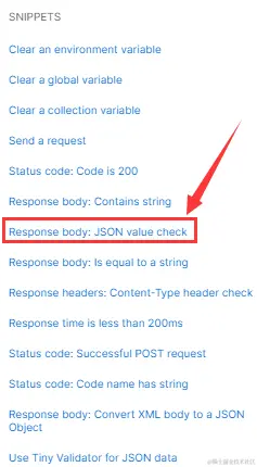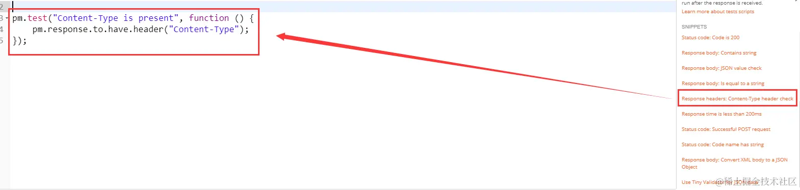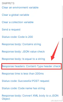 在SNIPPETS中,找到一项”Response headers:Content-Type header check”,意思为测试response Headers中的某个元素是否存在(如:Content-Type),该值可以根据实际需求替换成实际的headers参数去进行判断