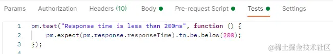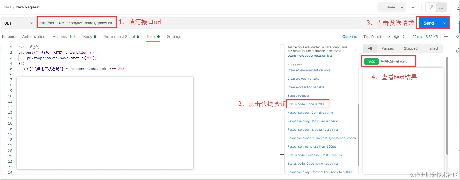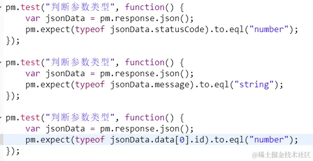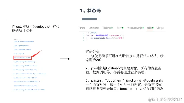 代码分析: 1、该使用场景可用在判断该接口是否相应成功,状态码为200 2、pm对象是Postman的主要对象,所有的内置函数,数据调用等,都需要通过它来实现。 3、pm.test("Judgment ",function())是postman的一个内置对象,第一个引号中的内容,是断言名称,可以根据需要来填写;function()为断言判断函数。