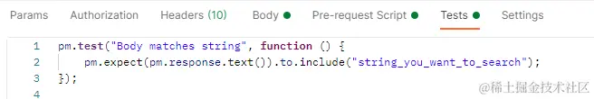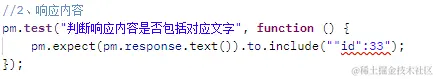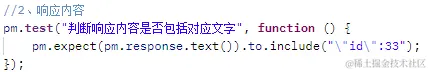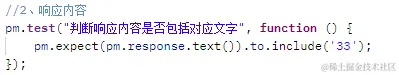 代码分析: 1、该使用场景可用在判断响应正文中是否包含该字段; 2、将其转化为伪代码格式: pm.expect(从response里获取的字符串).to.include("必须包含的内容"); 这样我们就可以比较容易地解读这句代码,即“期待”返回结果必须包含某一段内容