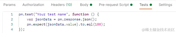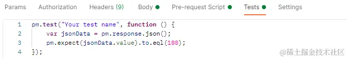 代码分析: 1、该使用场景可用在对响应内容进行解析,然后对解析后的内容进行参数获取或内容断言; 2、与方才的pm.response.text()不同,.text()方法是直接取响应的文本格式,.json()方法则是先将响应转化为json格式,jsonData变量其实是解析完JSON后的对象 3、在JS语法中,一个JSON对象获取其属性的值,直接是用jsonData.value