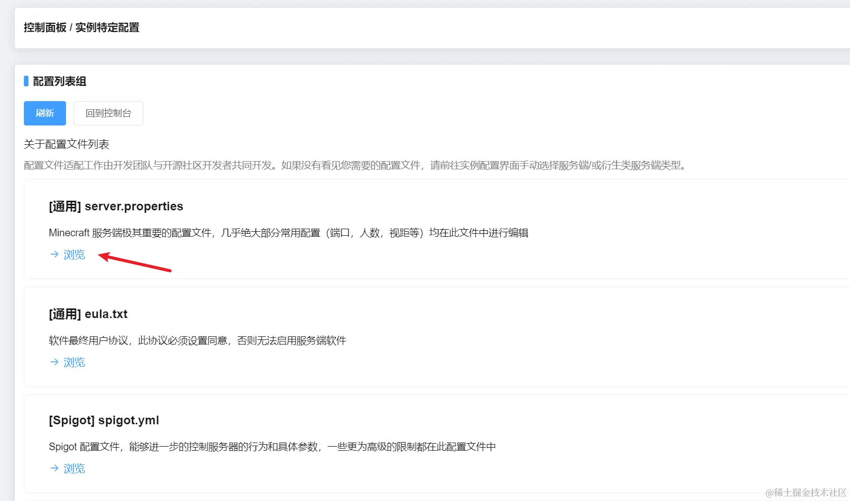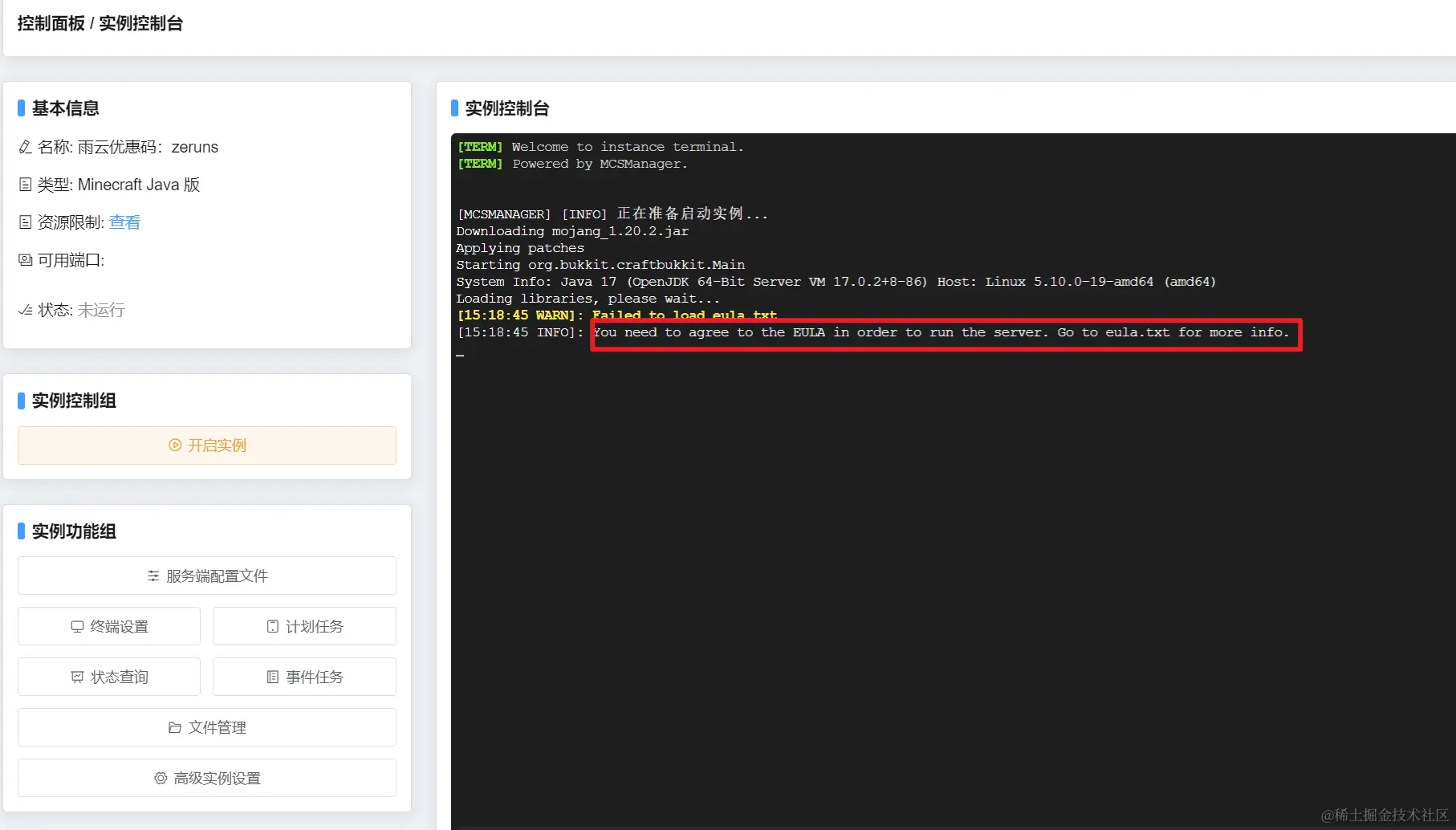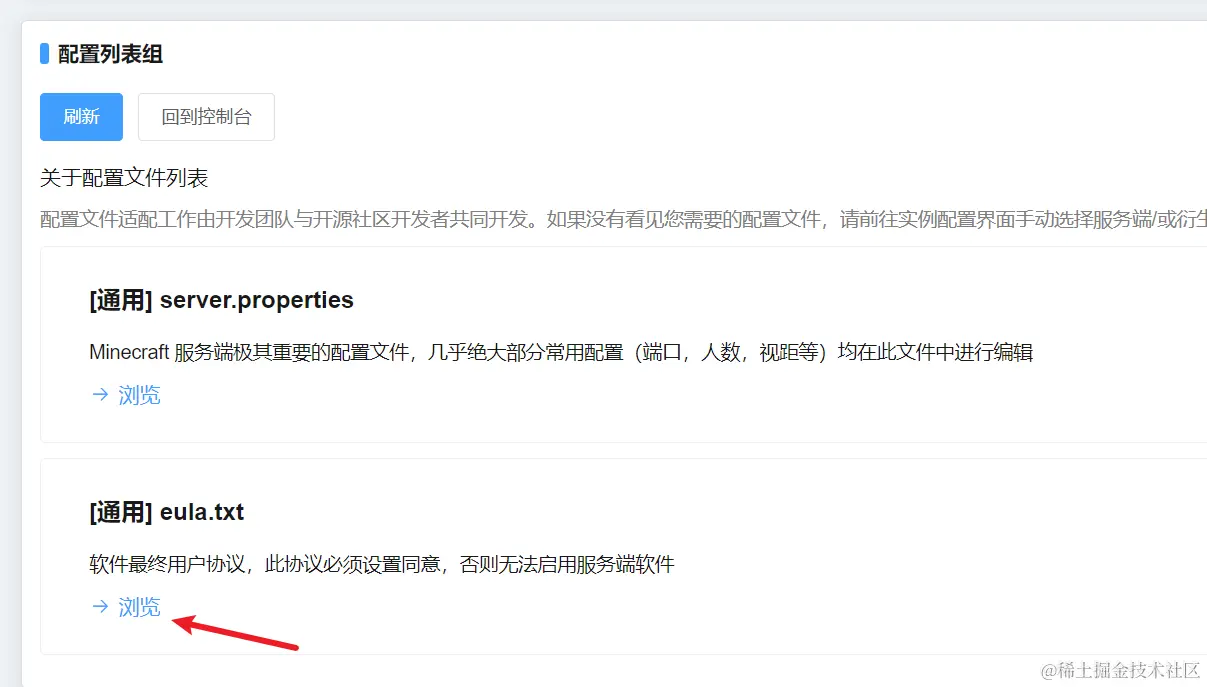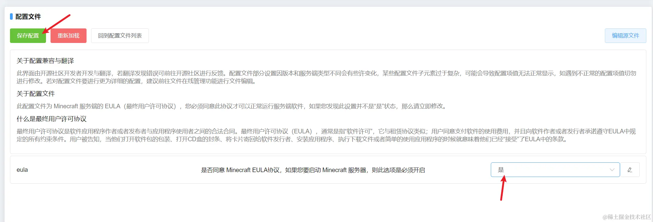 点击控制台左边的服务端配置文件,eula.txt那一项点击浏览,将eula改为是,然后保存。