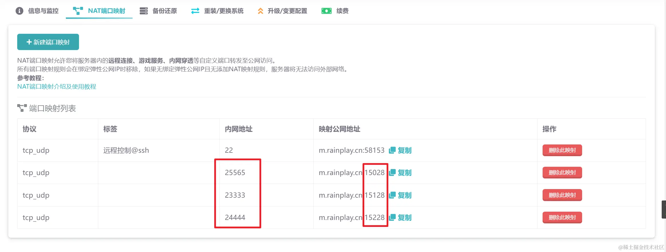 需要把上面这些端口映射出去。记住映射后的公网端口,下面会用到。