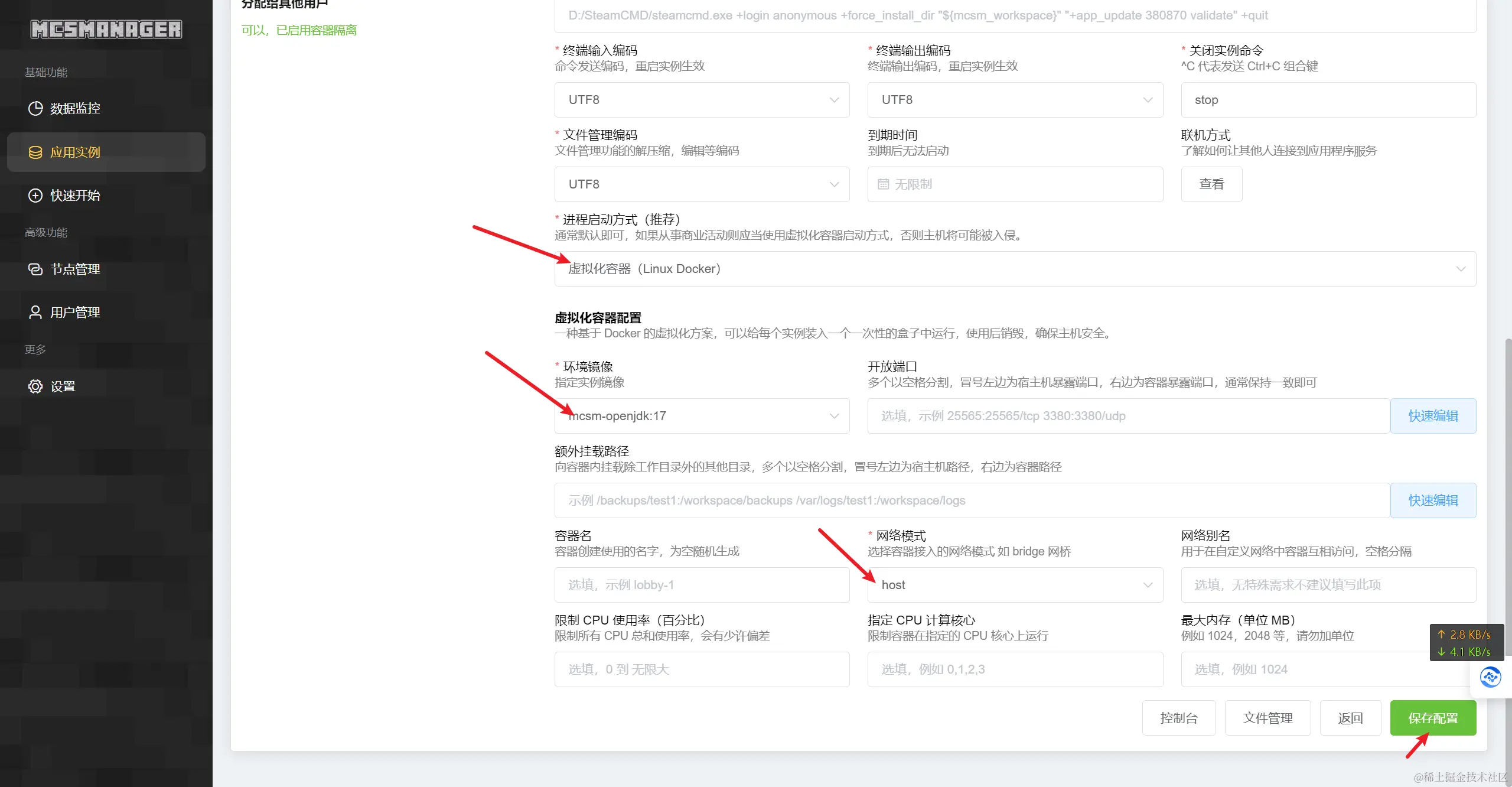 然后 进程启动方式选择虚拟化容器,环境镜像选择 mcsm-openjdk:17,网络模式选host,选好后点击右下角的保存,你也可以填写右下角的最大内存来限制docker容器最大占用的内存,保存后点控制台。