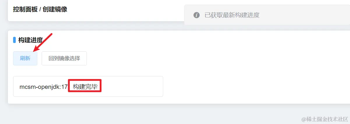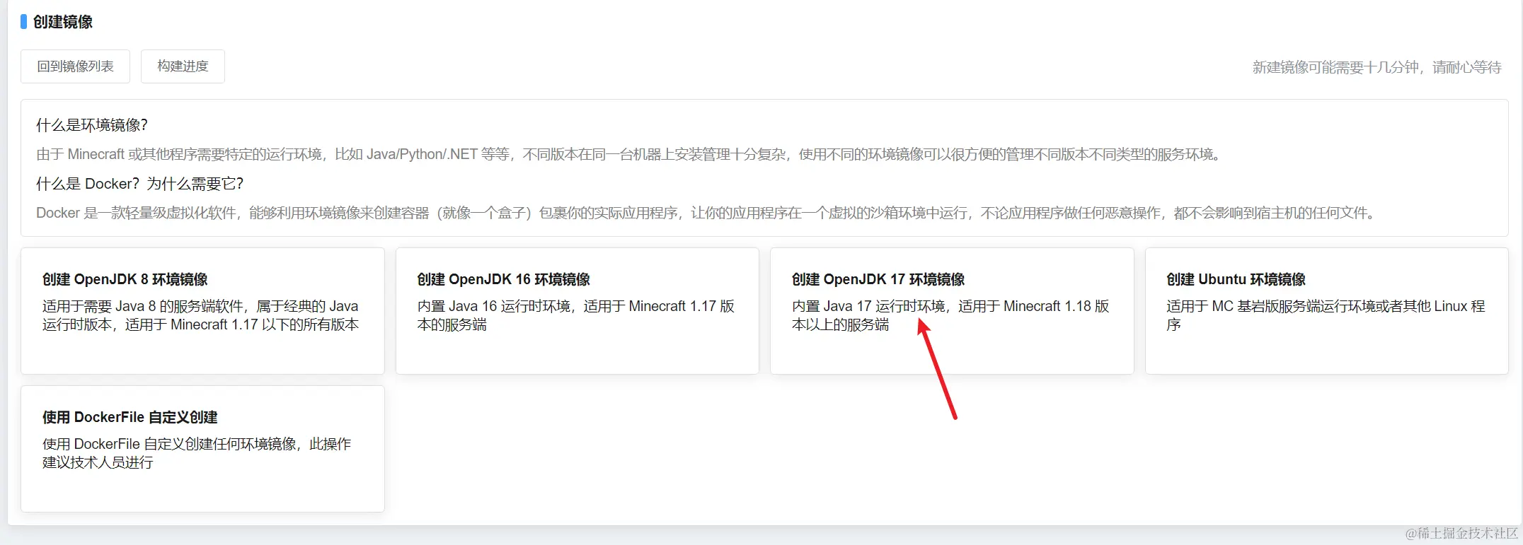 点击 新建镜像,接着点击 创建 OpenJDK 17 环境镜像(1.12.2及以下版本选JDK8;1.16及以上选JDK17)。