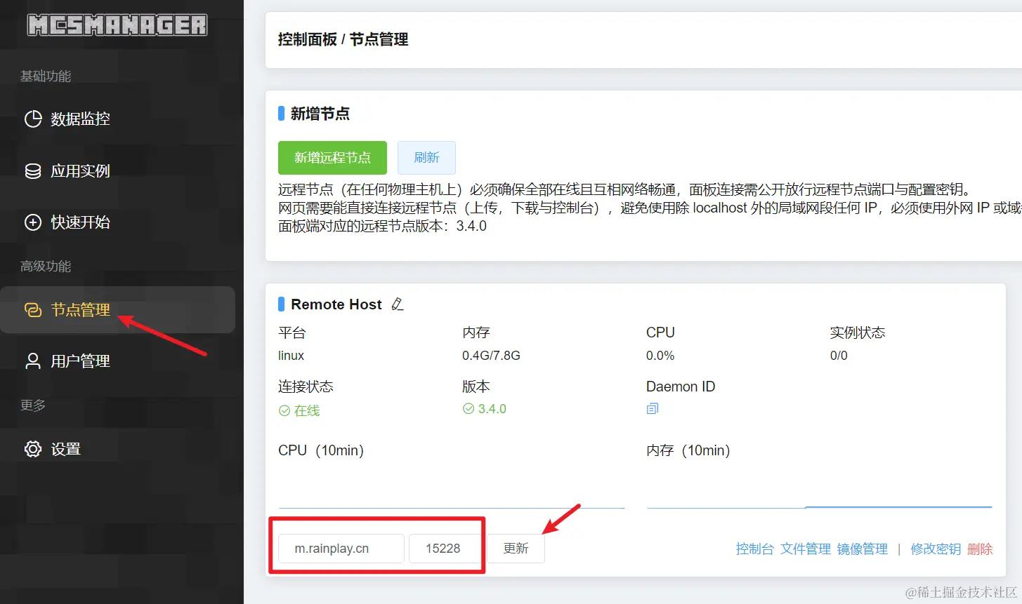 接着到节点管理那设置节点,把下图所示节点地址设置成你服务器IP或域名,端口设置成你24444端口映射出来的公网端口,我这里是15228,localhost改成服务器公网IP或域名,然后点击右边的更新按钮。