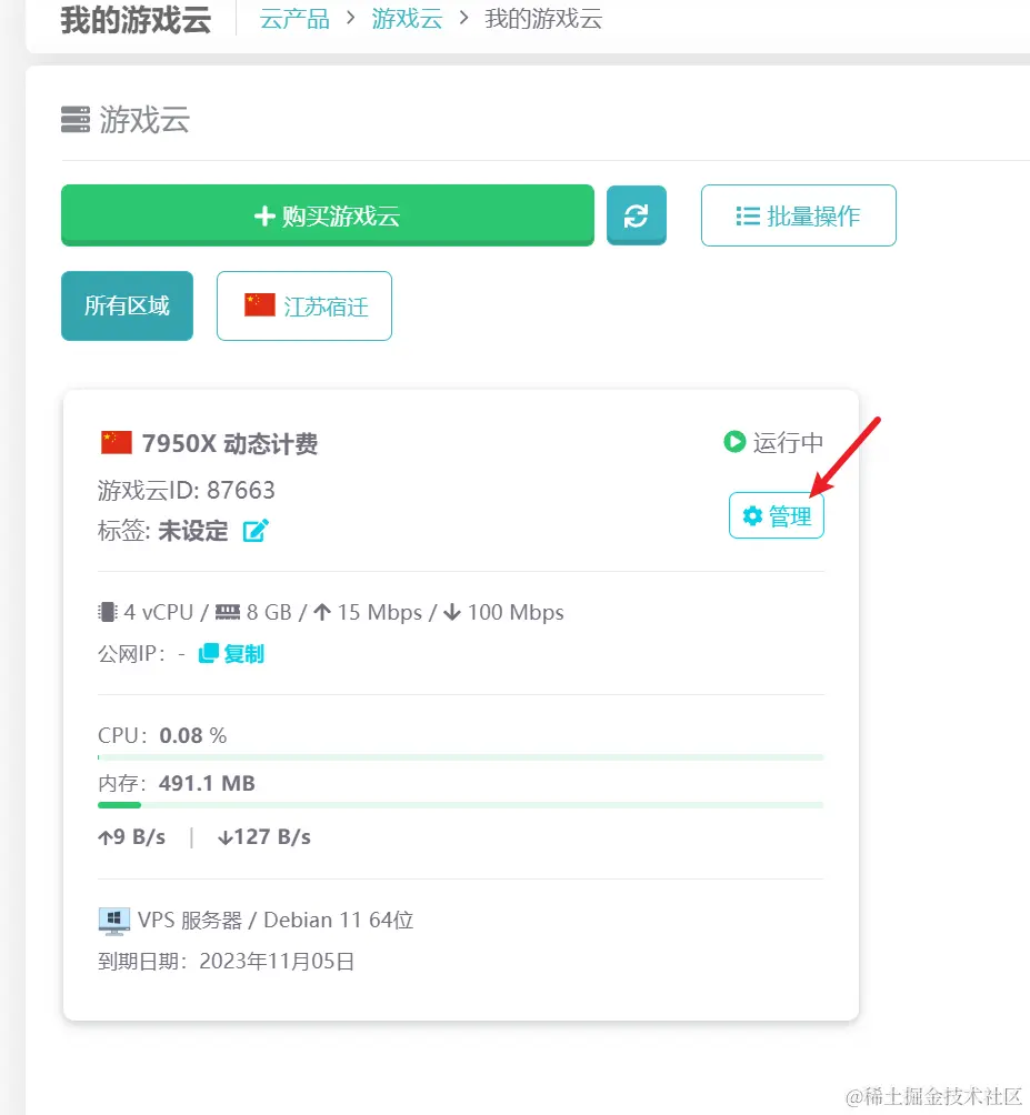 购买后即可在我的游戏云这里看到你买的面板服,点击管理