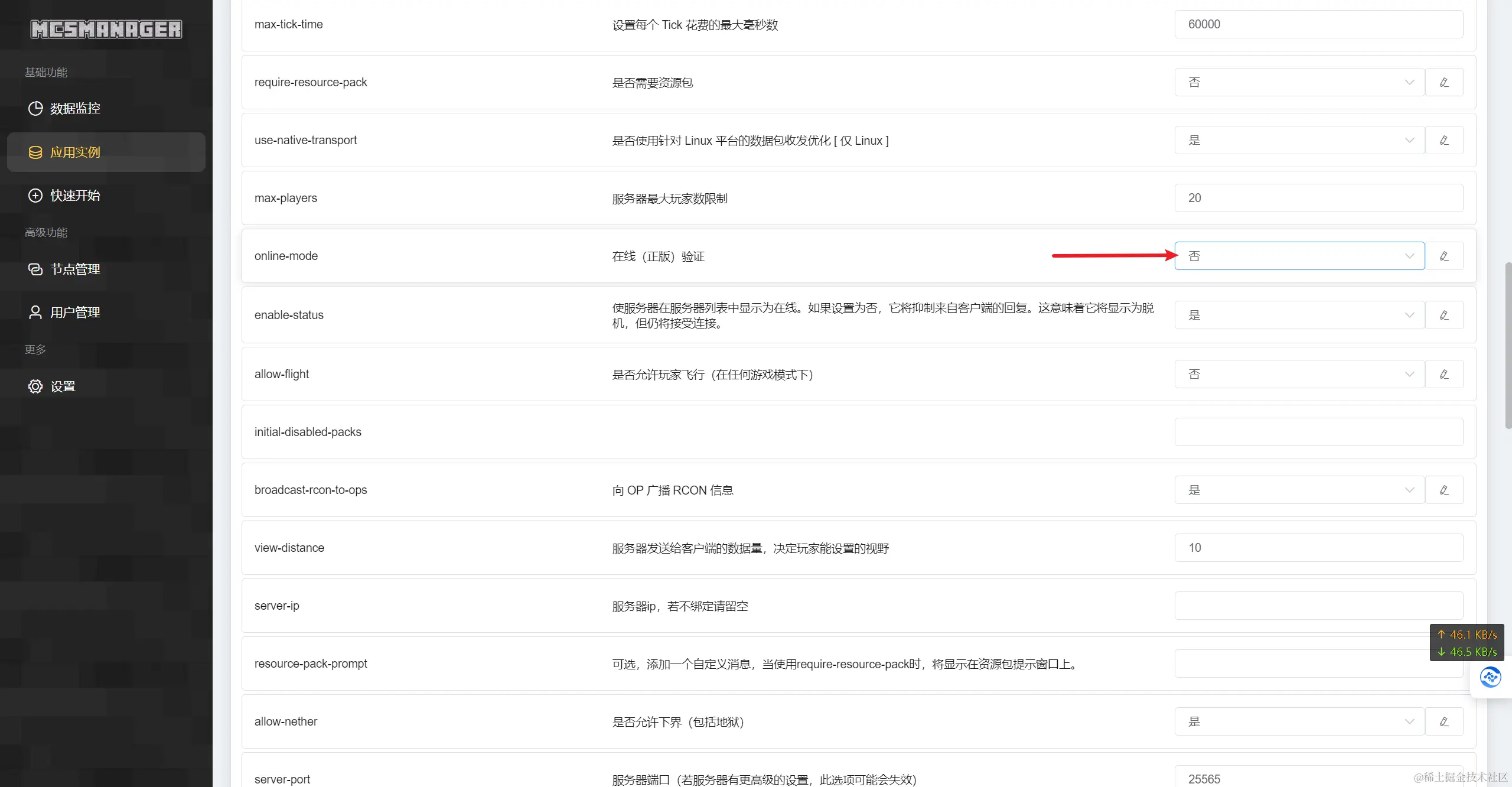 点 服务端配置文件→[通用] server.properties ,然后就可以修改服务器的设置,非正版用户记得将 在线正版验证 设为否,设置完成后要点保存。如果要修改端口,在这修改完配置文件后还得去雨云控制台设置端口映射。