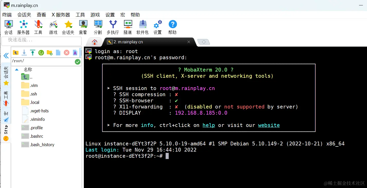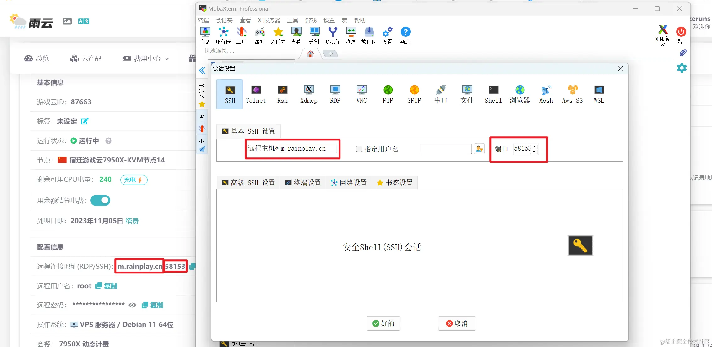 我这里用mobaxterm,在SSH客户端中输入你的服务器的IP地址或域名(雨云控制台获取),还有SSH端口,然后点击好的或者打开。