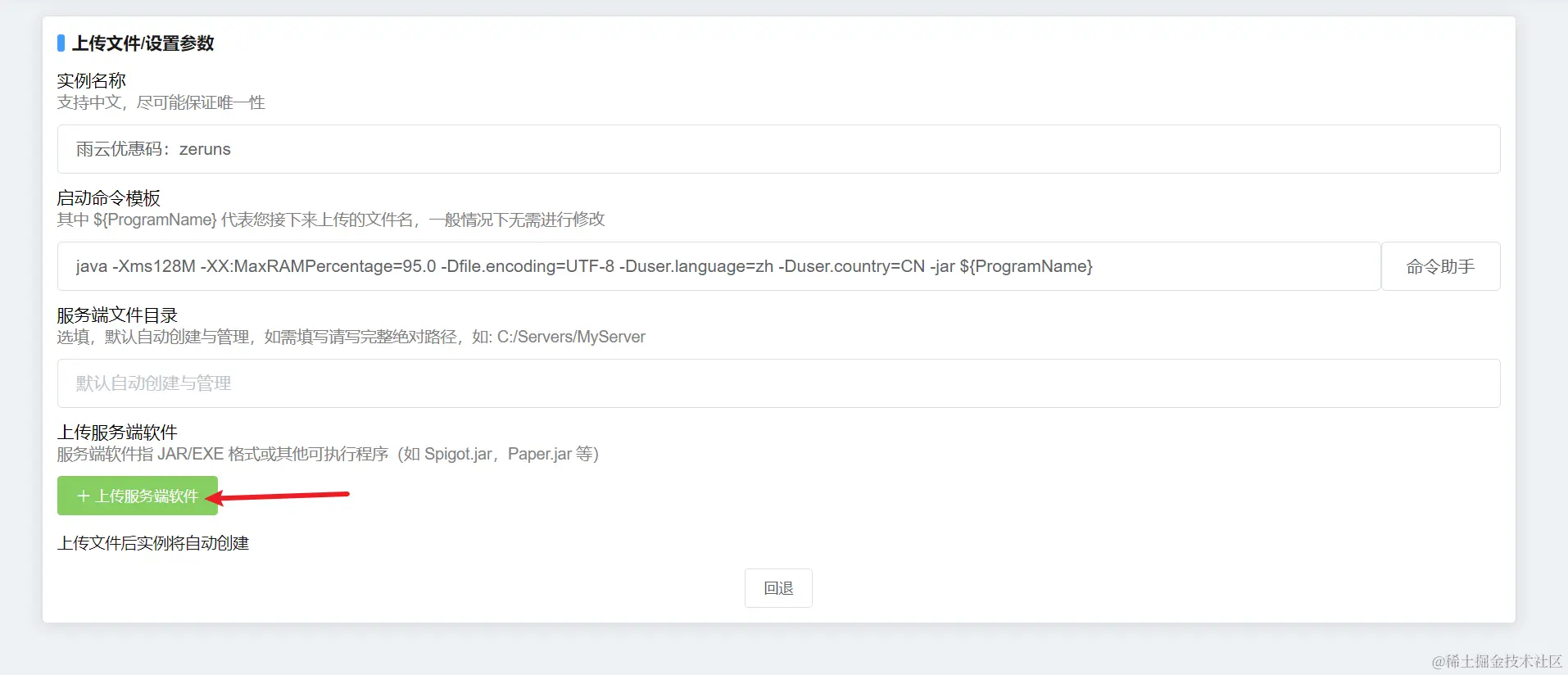 自己输入一个想设置的名称,启动命令输入 java -Xms128M -XX:MaxRAMPercentage=95.0 -Dfile.encoding=UTF-8 -Duser.language=zh -Duser.country=CN -jar ${ProgramName} ,然后点下面的上传服务端软件选择上面下载的jar文件。