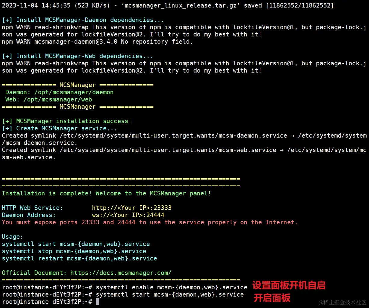 systemctl enable mcsm-{daemon,web}.service来开启开机自启 - 面板代码与运行环境自动安装在