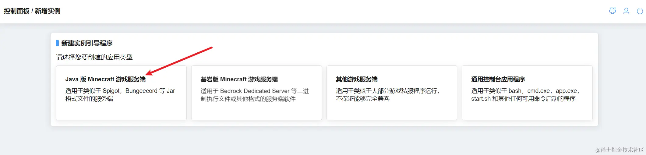点击 应用实例→新建实例→Java版Minecraft服务端→上传单个服务端软件