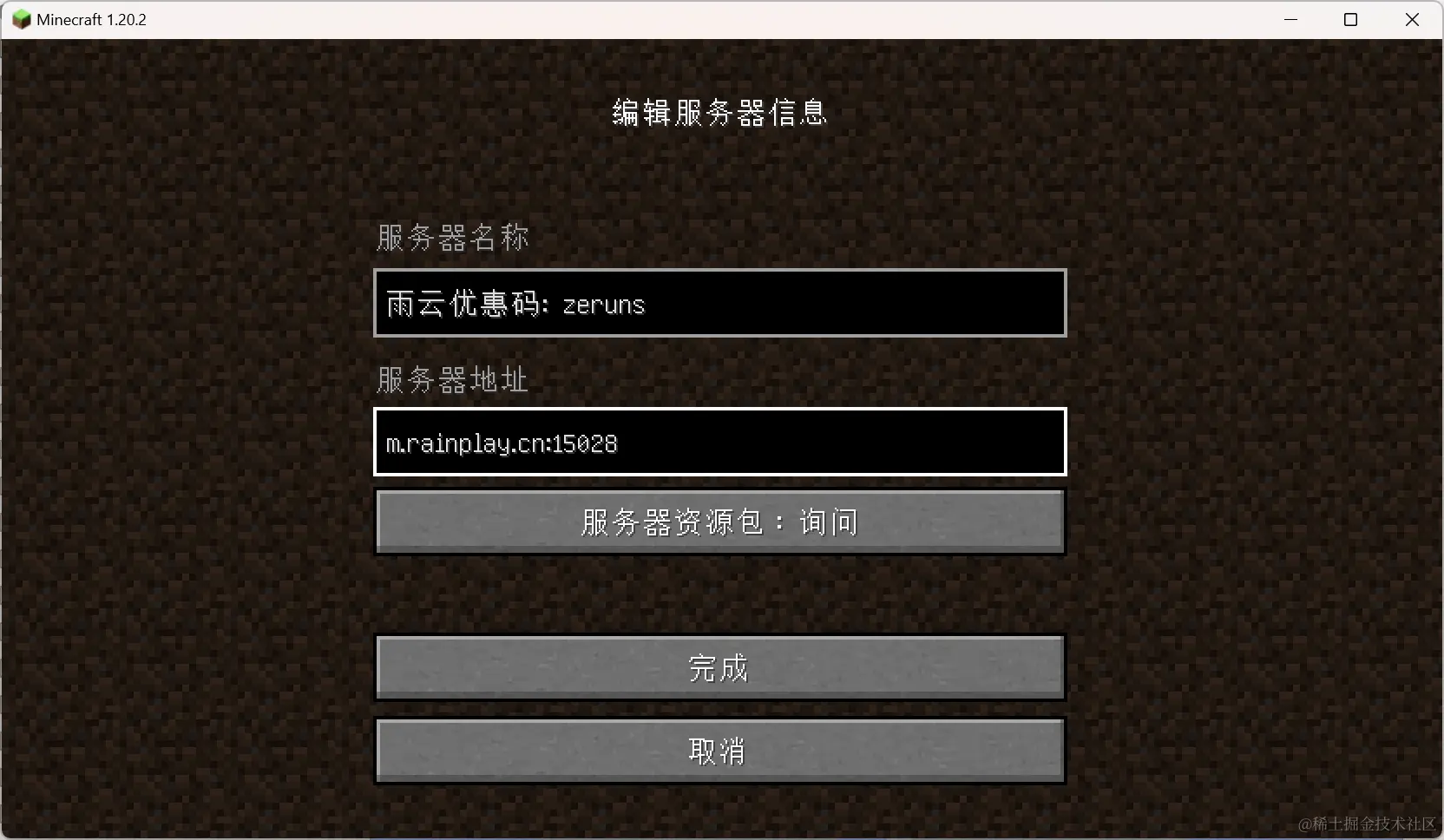 在游戏里点击多人游戏→添加服务器,输入你服务器的公网IP或域名,加上端口号,端口号是你上面设置的25565映射出来的公网端口,IP和端口之间用英文冒号分隔,如下图所示。
