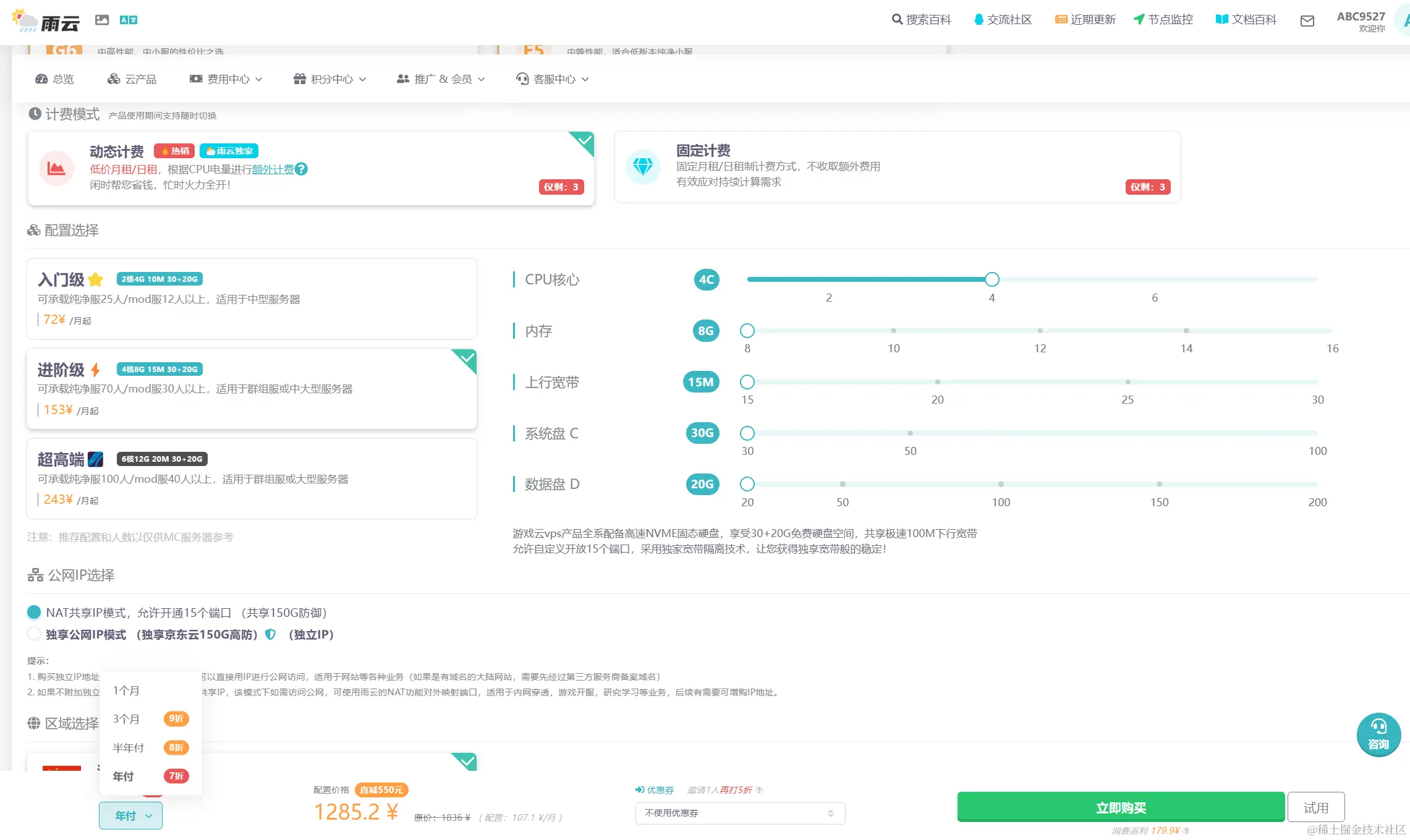 计费模式如果是经常玩的建议选固定计费,不常玩的选动态计费即可。公网IP选择NAT就行,可以开通15个端口,够MC服用了。