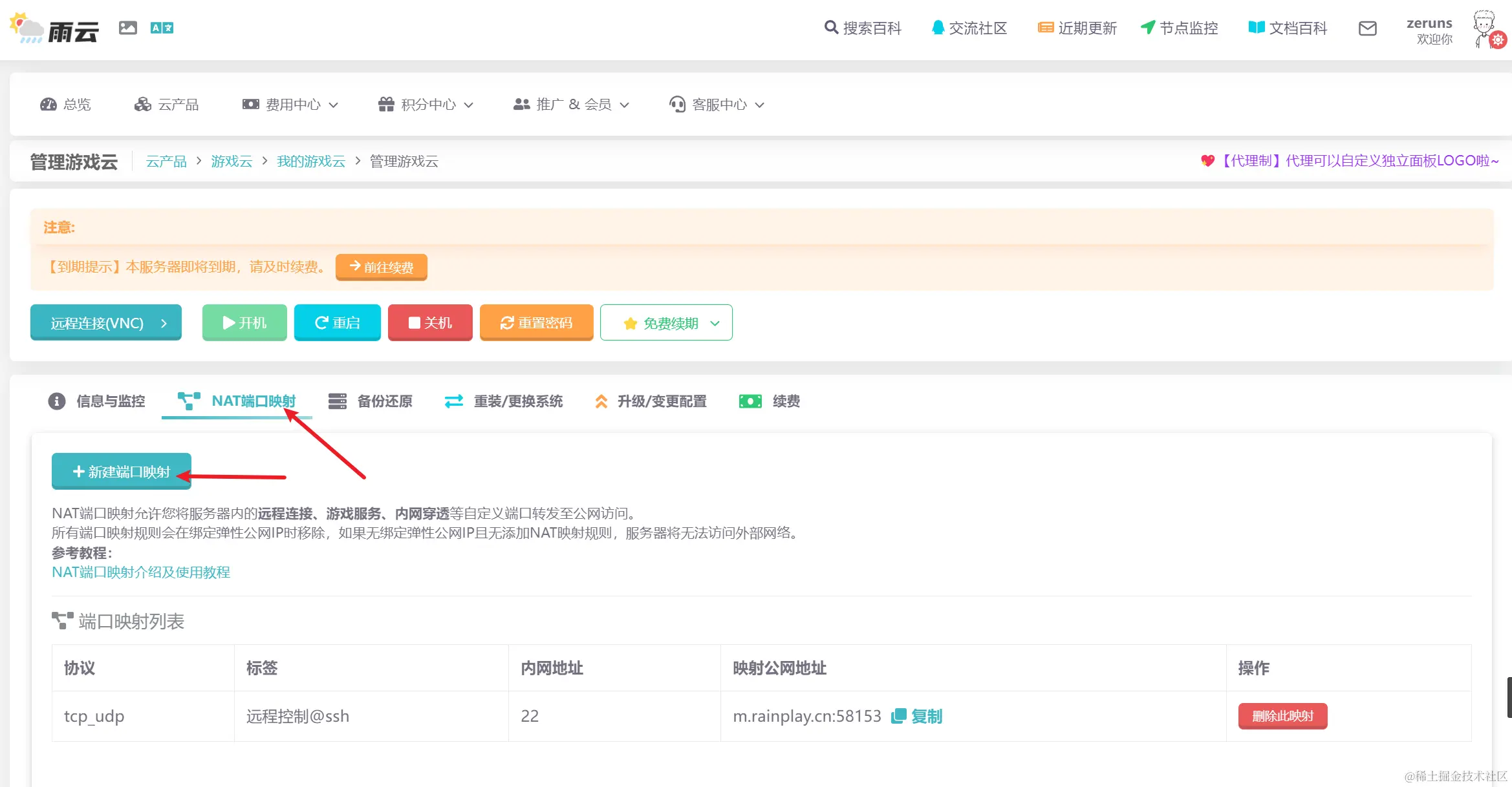 注册完账号后进到雨云控制台,游戏云入口可以在后台的 总览 和 云产品 部分找到: