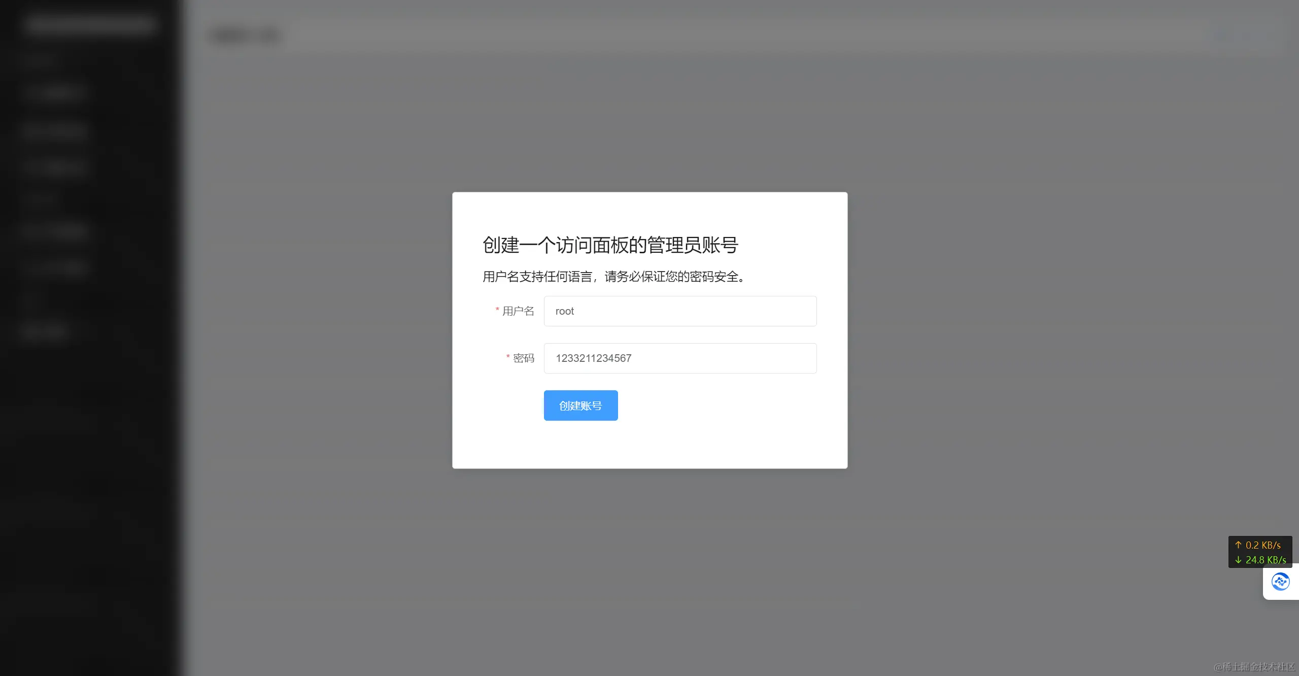 进去面板后按照提示设置自己的账号和密码。