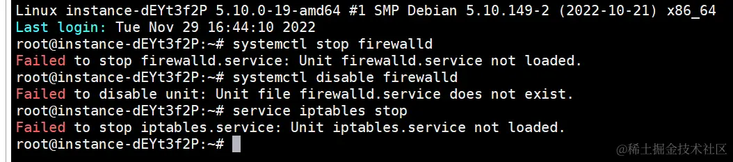 然后回到SSH终端输入下面这些命令来关闭系统自带防火墙(也可以不关闭防火墙,只需你自己配置开放所需要的端口即可,这样更安全,不过这里不细讲了)。