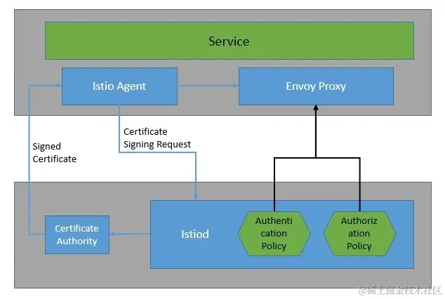 Istio为每个服务提供身份。与每个Envoy代理一起运行的Istio代理与istiod一起使用以自动进行密钥和证书轮换: